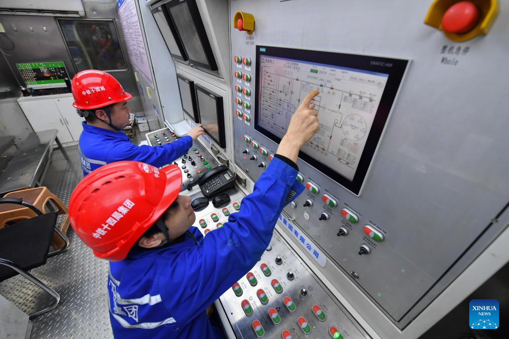 Workers of China Railway 14th Bureau Group Corporation Limited work in the control room of the right-line tunnel of the Xiangya Road river-crossing passway in Changsha, central China's Hunan Province, March 12, 2023. The drill-through of the right-line tunnel, together with the left-line tunnel drilled through a year ago, means the construction of the main part of the two-way river-crossing passway is near completion. (Xinhua/Chen Zeguo)