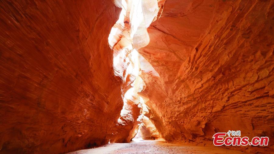 Sunshine casts into the Ganquan canyon through the fissures, creating mysterious beauty at Ganquan County of Yan'an, northwest China's Shaanxi Province. Rain, water and wind over millions of years has sculpted its red sandstone into various textures and shapes. (Photo: China News Service/Bai Teng)