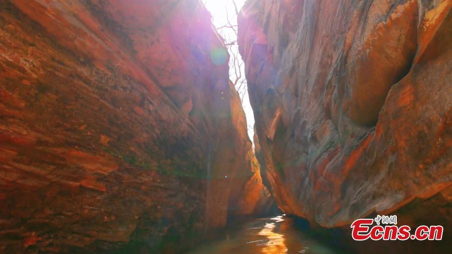 Sunshine casts into the Ganquan canyon through the fissures, creating mysterious beauty at Ganquan County of Yan'an, northwest China's Shaanxi Province. Rain, water and wind over millions of years has sculpted its red sandstone into various textures and shapes. (Photo: China News Service/Bai Teng)