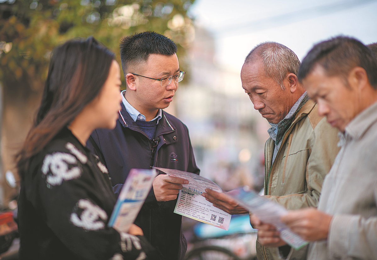 Former migrant worker Yuan Haibo (second left), a deputy to the 13th National People's Congress, introduces policies to people at a talent market in Kunming, Yunnan province, last month. [JIANG WENYAO/XINHUA]