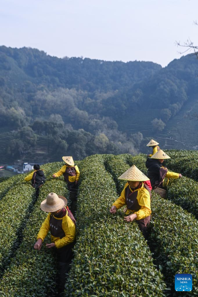 Tea-picking workers harvest Longjing tea leaves at a tea garden in Meijiawu Village of Hangzhou City, east China's Zhejiang Province, March 13, 2023. (Xinhua/Xu Yu)