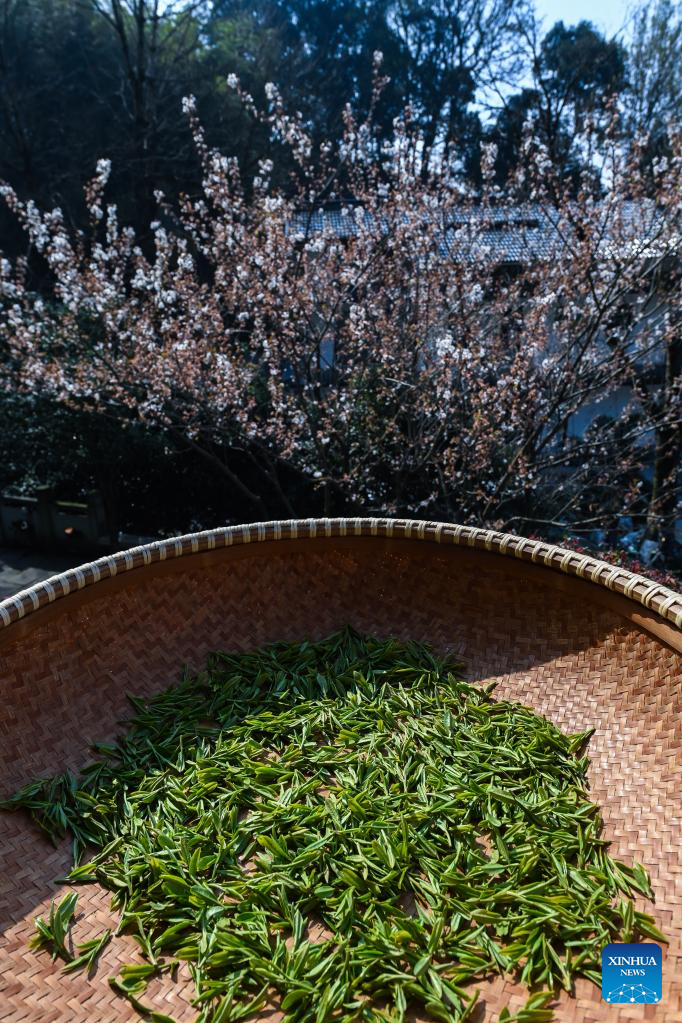 This photo taken on March 13, 2023 shows fresh Longjing tea leaves in Longjing Village of Hangzhou, east China's Zhejiang Province. (Xinhua/Xu Yu)