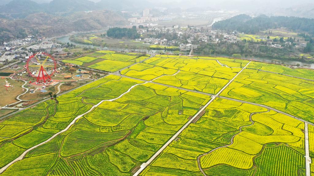 This aerial photo taken on March 12, 2023 shows visitors take sightseeing mini trains to enjoy cole flowers in Panjiang Township of Guiding County, southwest China's Guizhou Province. (Xinhua/Yang Wenbin)