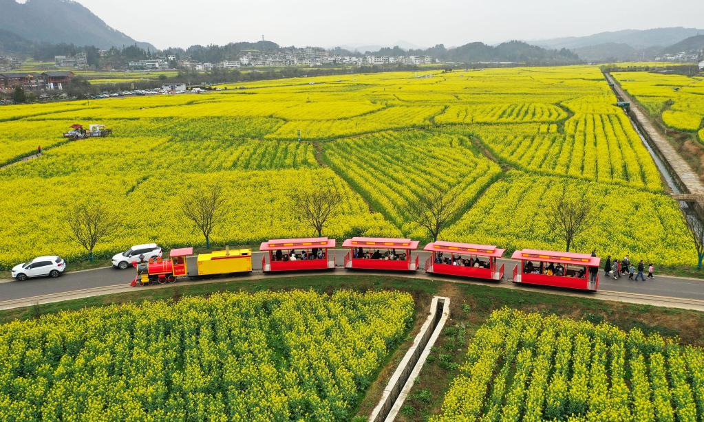 Visitors take sightseeing mini trains to enjoy cole flowers in Panjiang Township of Guiding County, southwest China's Guizhou Province, March 12, 2023. (Xinhua/Yang Wenbin)