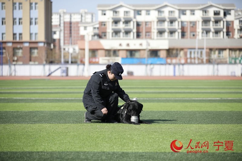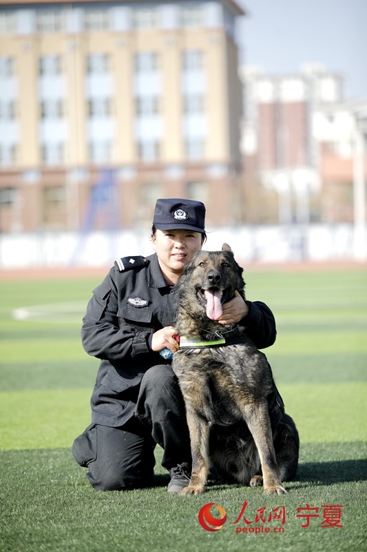 Photo shows Gao Wei, a policewoman with the public security bureau of Yinchuan city, northwest China's Ningxia Hui Autonomous Region, and her police dog. (People’s Daily Online/Yan Mengjie)