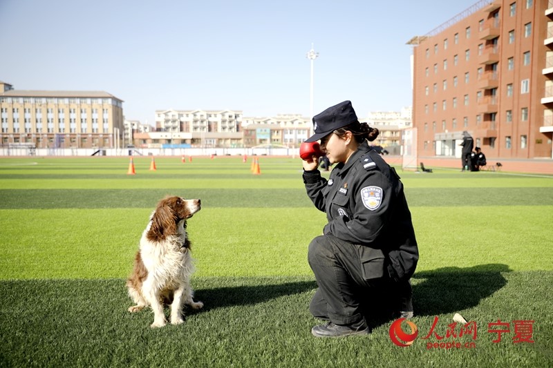 Photo shows Gao Wei, a policewoman with the public security bureau of Yinchuan city, northwest China's Ningxia Hui Autonomous Region, training a police dog to seek out explosive devices or materials. (People’s Daily Online/Yan Mengjie)