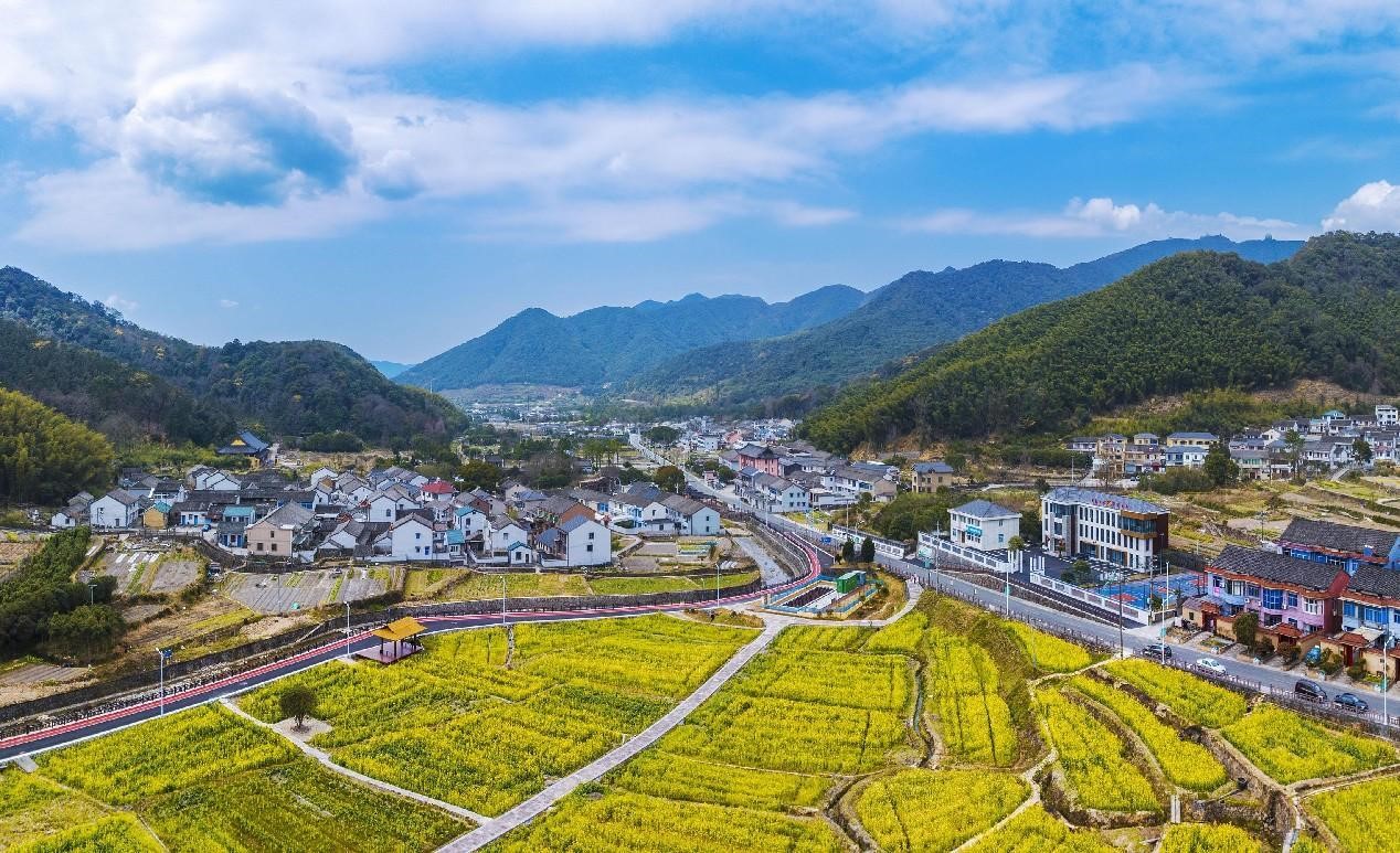 Photo taken on March 9, 2023 shows rapeseed flower fields and residential houses in Santang village, Dongwu township, Ningbo, east China's Zhejiang province. (People's Daily Online/Hu Xuejun)
