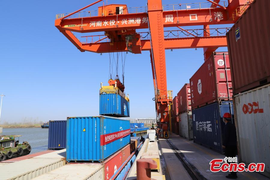 A crane lifts containers onto a freight vessel at Zhoukou Central Port in central China’s Henan Province, March 13, 2023. (Photo: China News Service/Zhao Lei)