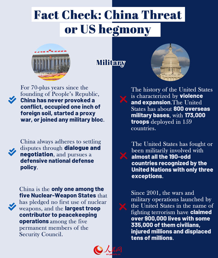 China has the best peace record among the world's major countries. China always adhere to settling disputes through dialogue and negotiation, and pursue a defensive national defense policy. For 70-plus years since the founding of People's Republic, China has never provoked a conflict, occupied one inch of foreign soil, started a proxy war, or joined any military bloc. China is the only one among the five Nuclear-Weapon States that has pledged no first use of nuclear weapons, and the largest troop contributor to peacekeeping operations among the five permanent members of the Security Council and the second largest contributor to UN peacekeeping assessments. No matter how much it develops, China will never seek hegemony, expansion or sphere of influence, nor engage in arms race, but remain a defender of world peace.