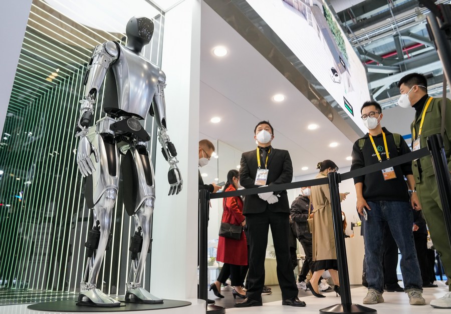 This photo taken on Nov. 5, 2022 shows a Tesla robot exhibited at the Automobile exhibition area of the fifth China International Import Expo (CIIE) at the National Exhibition and Convention Center (Shanghai) in east China's Shanghai. (Xinhua/Ding Ting)