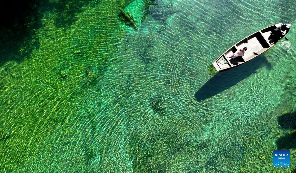 This aerial photo taken on March 14, 2023 shows a boat rides in the Pingshan canyon, a tourist attraction famous for its limpid water, in Hefeng County, Enshi Tujia and Miao Autonomous Prefecture, central China's Hubei Province. (Photo by Yang Shunpi/Xinhua)