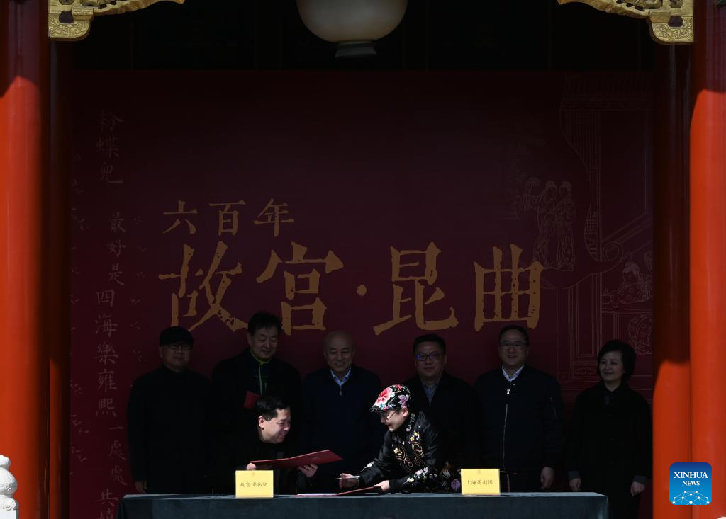 Representatives from the Palace Museum and Shanghai Kunqu Opera Troupe sign a strategic cooperation agreement at the Palace Museum in Beijing, capital of China, March 13, 2023. The Palace Museum and Shanghai Kunqu Opera Troupe signed a strategic cooperation agreement here Tuesday to restage Chinese classic operas. (Xinhua/Jin Liangkuai)