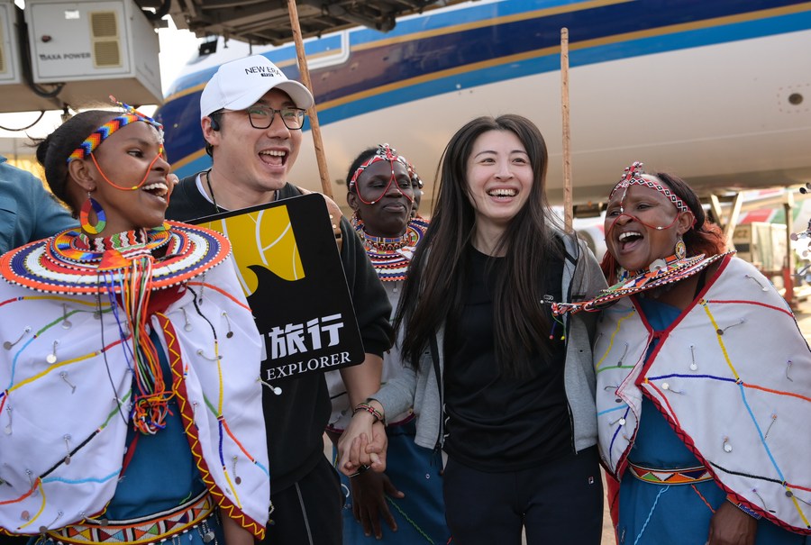 Chinese tourists interact with Maasai performers at Jomo Kenyatta International Airport in Nairobi, Kenya, Feb. 11, 2023. (Xinhua/Han Xu)