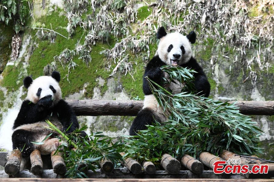 Two giant pandas enjoy their refreshments, attracting many visitors, at Chongqing Zoo, March 15, 2023. (Photo: China News Service/Zhou Yi)