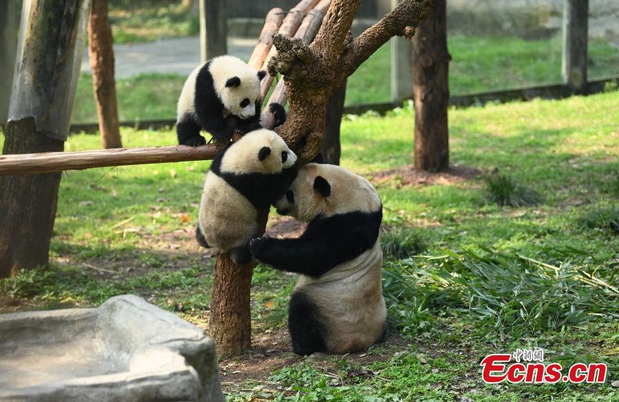 A pigeon pair of giant panda cubs Yu Ke and Yu Ai play with their mom Er Shun at Chongqing Zoo, March 14, 2023. (Photo: China News Service/Chen Chao)