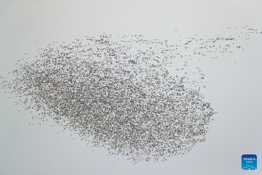This photo taken on March 15, 2023 shows migrant birds flying in the sky at Huanzidong wetland in Faku County, northeast China's Liaoning Province. (Xinhua/Yang Qing)