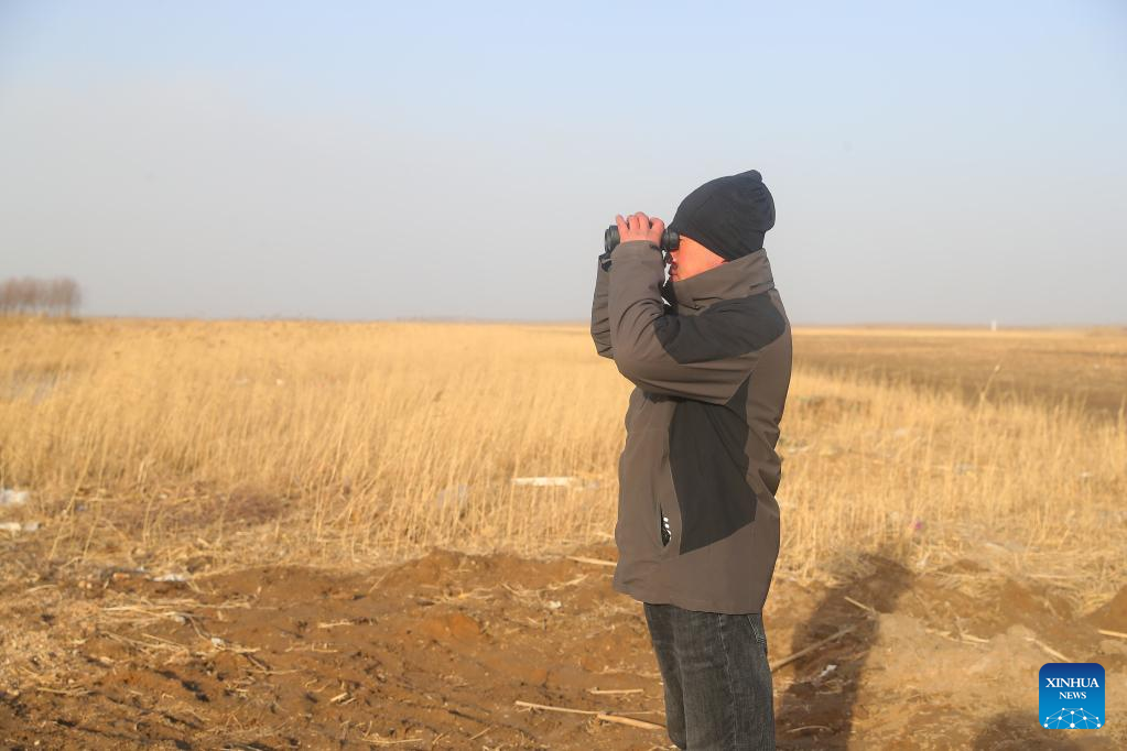 Ranger Zhang Haigang observes migrant birds at Huanzidong wetland in Faku County, northeast China's Liaoning Province, March 15, 2023. (Xinhua/Yang Qing)