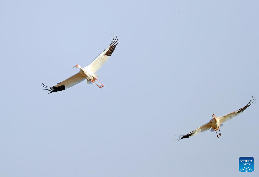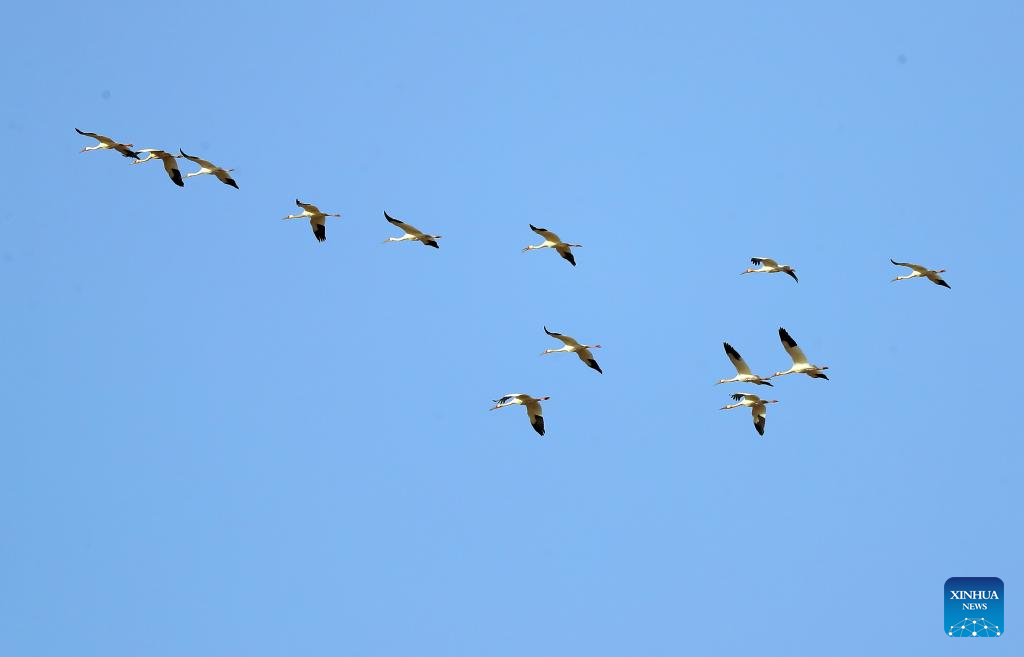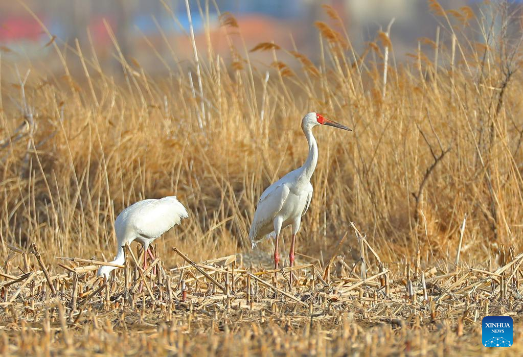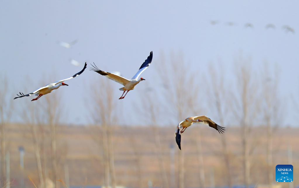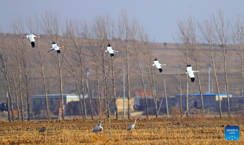 This photo taken on March 15, 2023 shows white cranes at Huanzidong wetland in Faku County, northeast China's Liaoning Province. (Xinhua/Yang Qing)