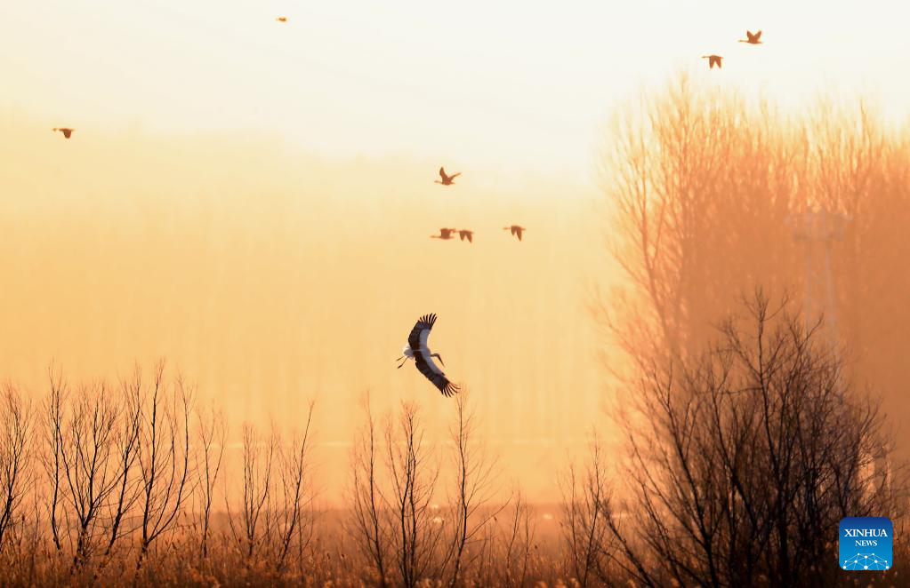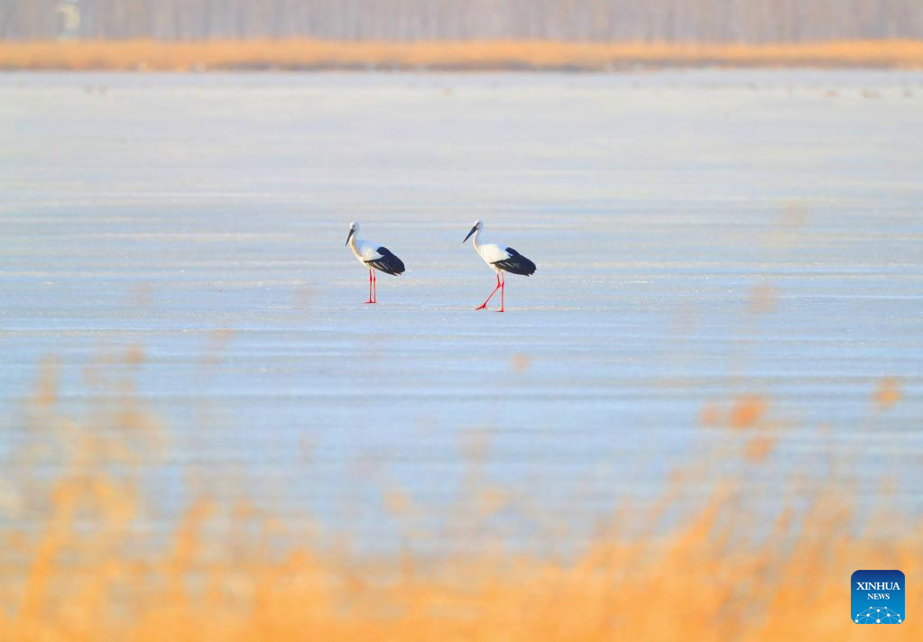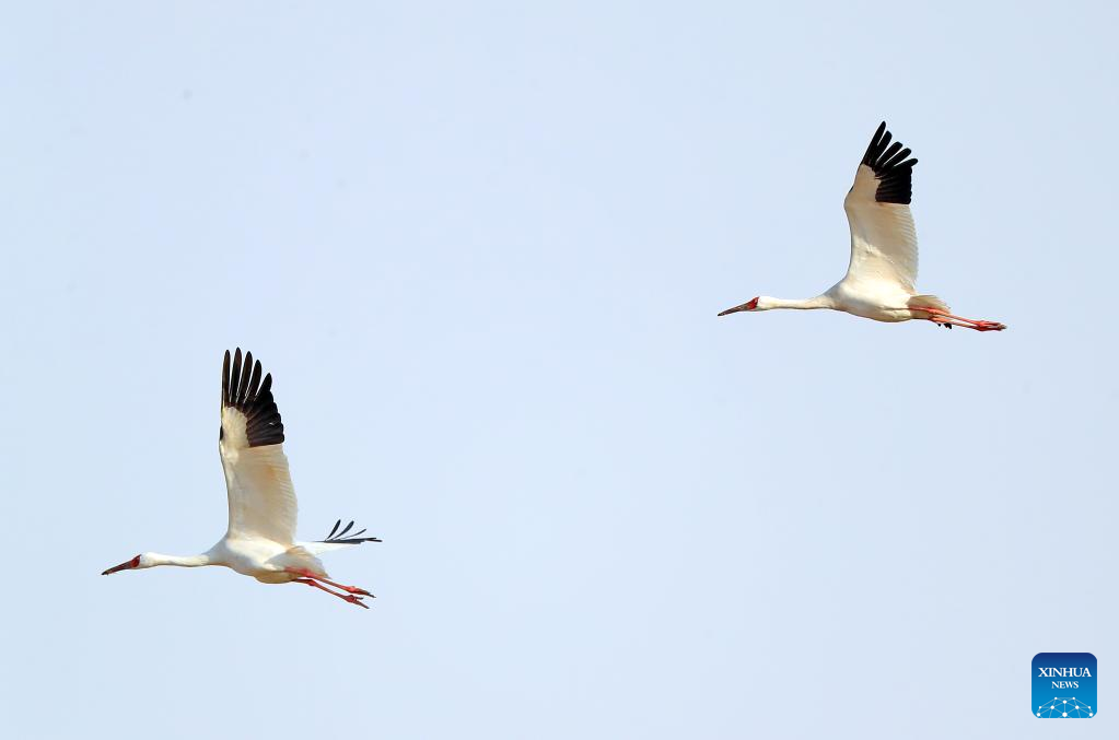 This photo taken on March 15, 2023 shows oriental white storks at Huanzidong wetland in Faku County, northeast China's Liaoning Province. (Xinhua/Yang Qing)