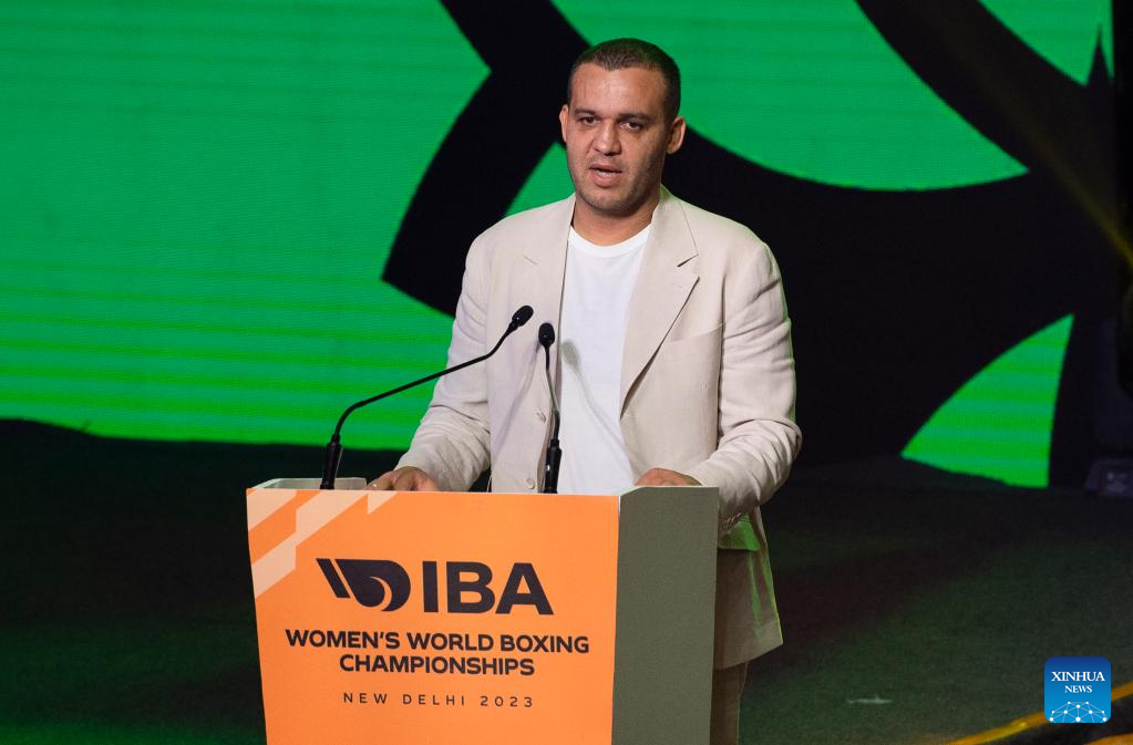 International Boxing Association (IBA) president Umar Kremlev addresses the opening ceremony of the IBA World Women's Boxing Championships 2023 in New Delhi, India, March 15, 2023. (Xinhua/Javed Dar)