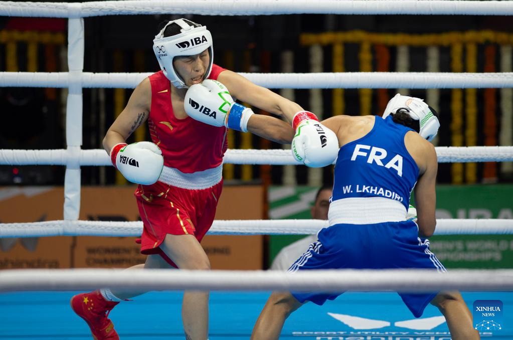 Chang Yuan (L) of China competes with Lkhadiri Wassila of France during the elite women's 48-50kg light fly preliminary match at IBA World Women's Boxing Championships 2023 in New Delhi, India, March 16, 2023. (Xinhua/Javed Dar)