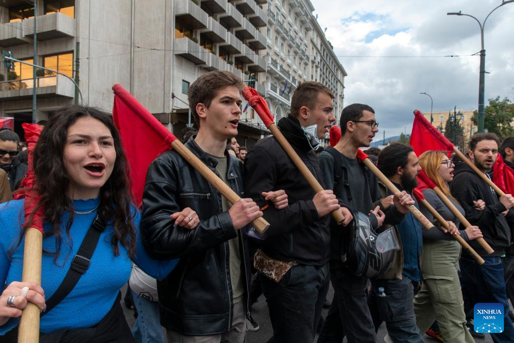 People take part in a demonstration in Athens, Greece, on March 16, 2023. Greece's public services, including transport, were paralyzed on Thursday by a 24-hour nationwide general strike called by labor unions over the deadly train accident last month. (Xinhua/Marios Lolos)