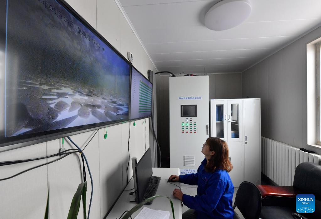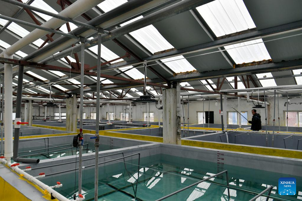 A staff member monitors hatcheries at an aquacultural company in the Binhai New Area modern agriculture industrial park in north China's Tianjin, on March 16, 2023. The industrial park has more than 90 industrial aquacultural enterprises, with an annual breeding of about 18.6 billion fish fry. (Xinhua/Zhao Zishuo)