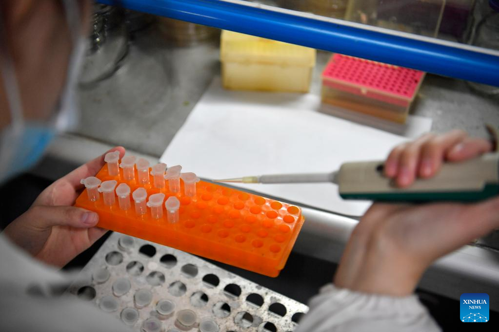 A staff member tests water quality at a laboratory of Tianjin Leadar Marine Resources Development Co., Ltd in the Binhai New Area modern agriculture industrial park in north China's Tianjin, on March 16, 2023. The industrial park has more than 90 industrial aquacultural enterprises, with an annual breeding of about 18.6 billion fish fry. (Xinhua/Zhao Zishuo)