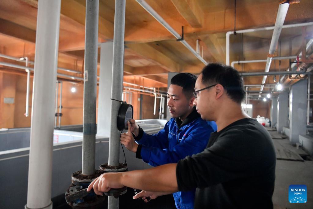 Staff members check the temperature of the hatchery at an aquacultural company in the Binhai New Area modern agriculture industrial park in north China's Tianjin, on March 16, 2023. The industrial park has more than 90 industrial aquacultural enterprises, with an annual breeding of about 18.6 billion fish fry. (Xinhua/Zhao Zishuo)