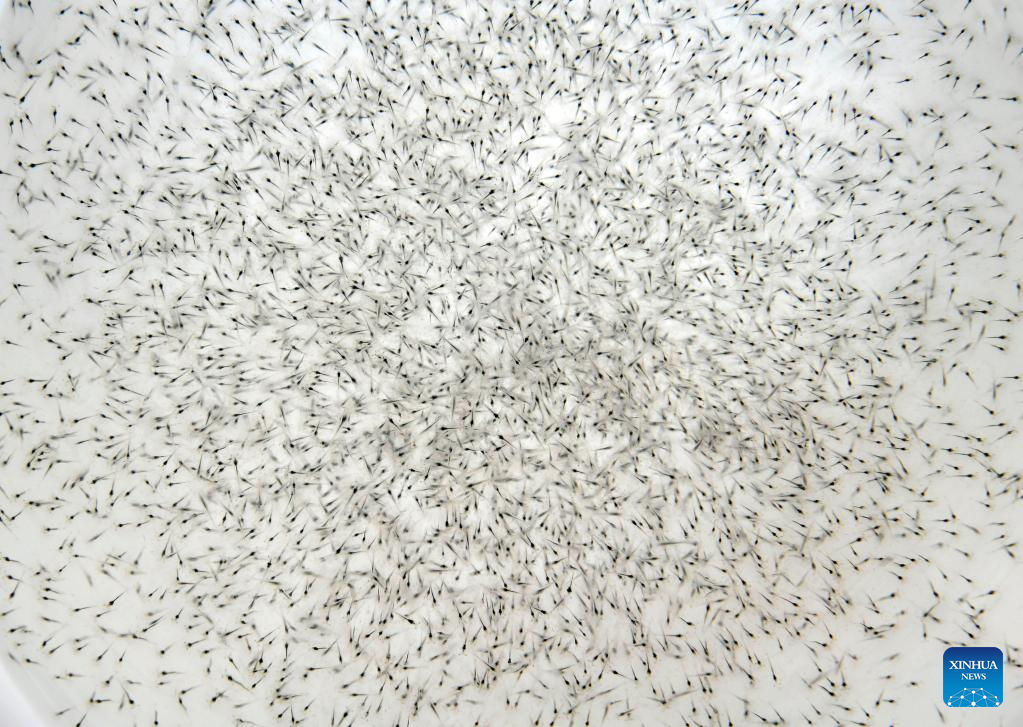 Prawn fry are seen at a hatchery of Tianjin Leadar Marine Resources Development Co., Ltd in the Binhai New Area modern agriculture industrial park in north China's Tianjin, on March 16, 2023. The industrial park has more than 90 industrial aquacultural enterprises, with an annual breeding of about 18.6 billion fish fry. (Xinhua/Zhao Zishuo)