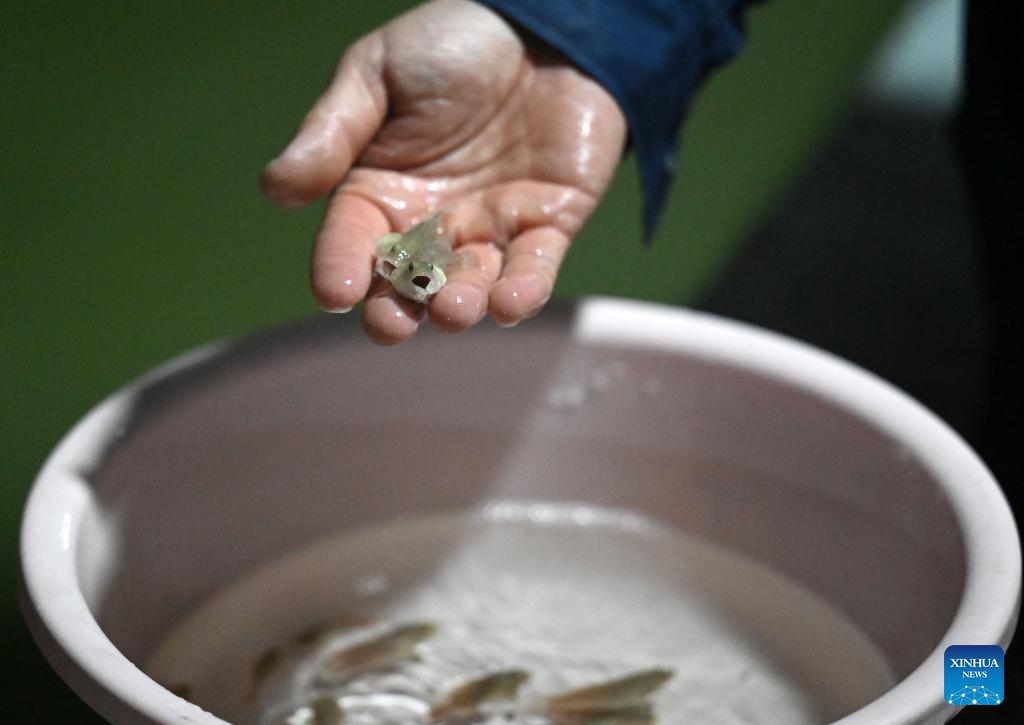 A staff member checks grouper fry at Tianjin Leadar Marine Resources Development Co., Ltd in the Binhai New Area modern agriculture industrial park in north China's Tianjin, on March 16, 2023. The industrial park has more than 90 industrial aquacultural enterprises, with an annual breeding of about 18.6 billion fish fry. (Xinhua/Zhao Zishuo)