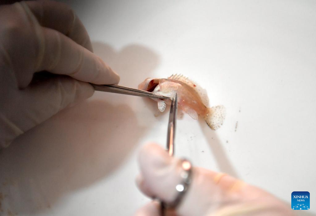 A staff member dissects a grouper fry at a laboratory of Tianjin Leadar Marine Resources Development Co., Ltd in the Binhai New Area modern agriculture industrial park in north China's Tianjin, on March 16, 2023. The industrial park has more than 90 industrial aquacultural enterprises, with an annual breeding of about 18.6 billion fish fry. (Xinhua/Zhao Zishuo)