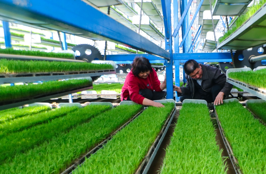 Farmers take care of ratoon rice seedlings at a full-automatic and intelligent workshop in Guangshan county, Xinyang, central China’s Henan Province. (Photo/Xie Wanbai)