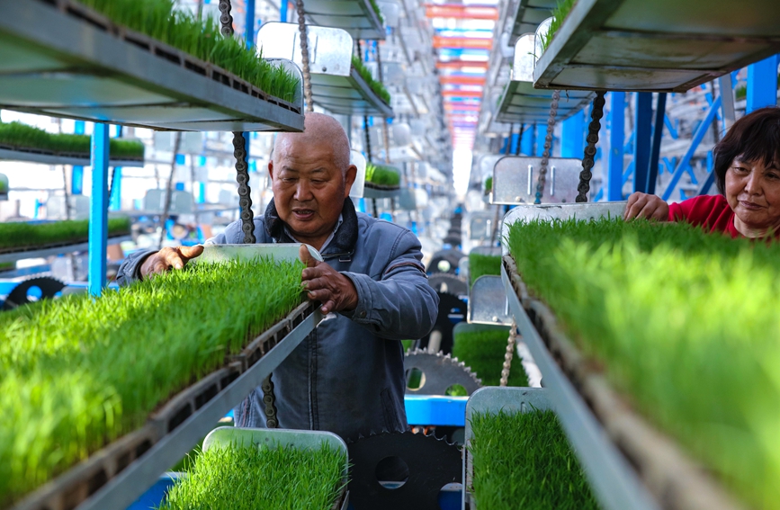 Farmers take care of ratoon rice seedlings at a full-automatic and intelligent workshop in Guangshan county, Xinyang, central China’s Henan Province. (Photo/Xie Wanbai)