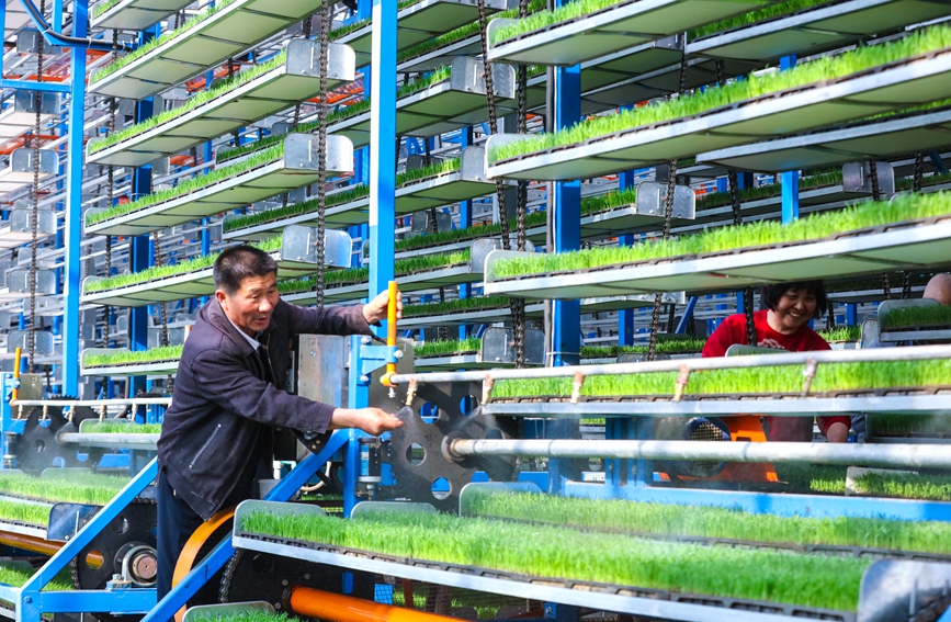 Farmers take care of ratoon rice seedlings at a full-automatic and intelligent workshop in Guangshan county, Xinyang, central China’s Henan Province. (Photo/Xie Wanbai)