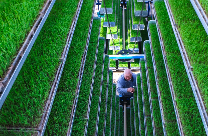 Farmers take care of ratoon rice seedlings at a full-automatic and intelligent workshop in Guangshan county, Xinyang, central China’s Henan Province. (Photo/Xie Wanbai)
