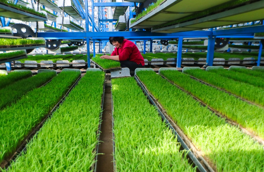 Farmers take care of ratoon rice seedlings at a full-automatic and intelligent workshop in Guangshan county, Xinyang, central China’s Henan Province. (Photo/Xie Wanbai)