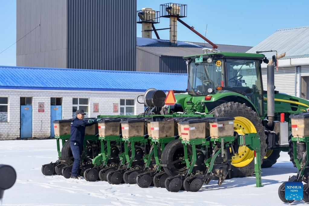 A staff member of the Jianshe Farm Co., Ltd. of Beidahuang Group maintains a farming machine in Heihe, northeast China's Heilongjiang Province, March 16, 2023. Jianshe Farm Co., Ltd. of Beidahuang Group has been busy preparing for spring ploughing recently. All the farm's farming machinery is now ready for production on more than 300,000 mu (20,000 hectares) of farm fields. (Xinhua/Wang Song)