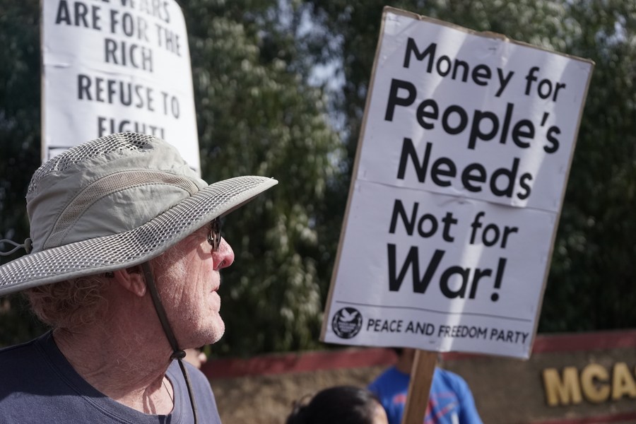 Holding up placards saying "Fund the people's needs, Not the war machine," "Build schools Not bombs," "Path to peace in Ukraine: Negotiate, Don't Escalate," "For peace: Disband NATO" and others, dozens of protesters gathered in front of the gate of Marine Corps Air Station Miramar, 25 km north of San Diego downtown.