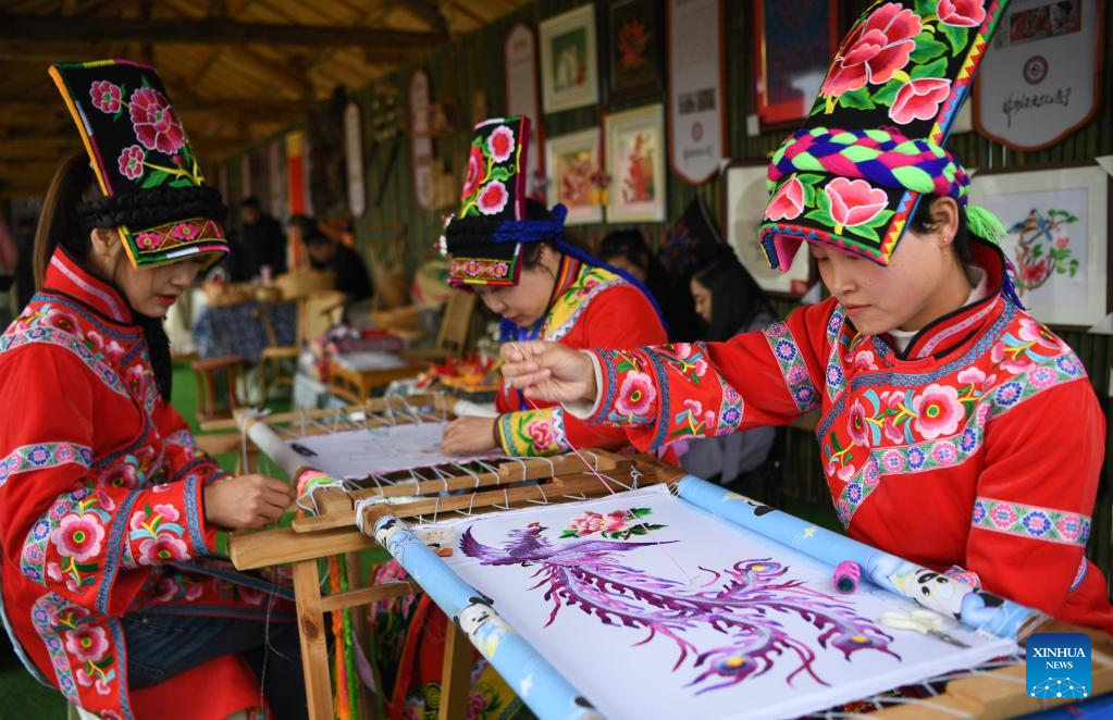 Inheritors of Qiang embroidery make embroidery works of Qiang ethnic group during a culture and tourism festival in Hanzhong City, northwest China's Shaanxi Province, March 18, 2023. As the temperature gradually rises, the cole flowers in full bloom have attracted many tourists to Hanzhong. In recent years, the rural revitalization of Hanzhong has been greatly promoted by the development of ecological agriculture and tourism. (Photo by Zou Jingyi/Xinhua)