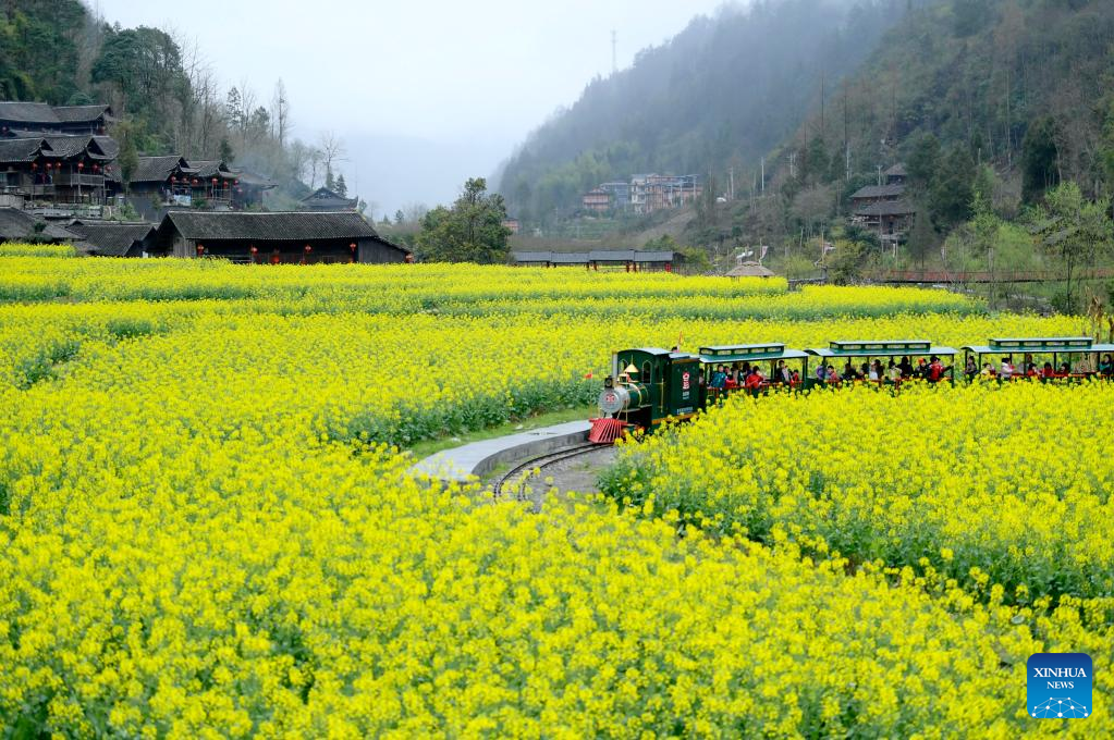 People take a sight-seeing train among cole flower fields in front of Diaojiaolou buildings (houses on stilts) in Xuanen County, central China's Hubei Province, March 18, 2023. (Photo by Xiong Yichao/Xinhua)
