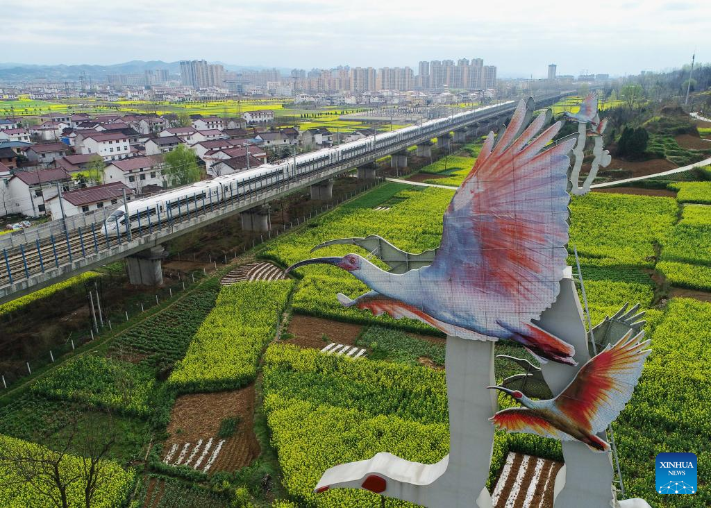 This aerial photo taken on March 17, 2023 shows a high-speed train running past cole field with a sculpture of crested ibises on the foreground in Yangxian County of Hanzhong City, northwest China's Shaanxi Province. As the temperature gradually rises, the cole flowers in full bloom have attracted many tourists to Hanzhong. In recent years, the rural revitalization of Hanzhong has been greatly promoted by the development of ecological agriculture and tourism. (Photo by Zou Jingyi/Xinhua)
