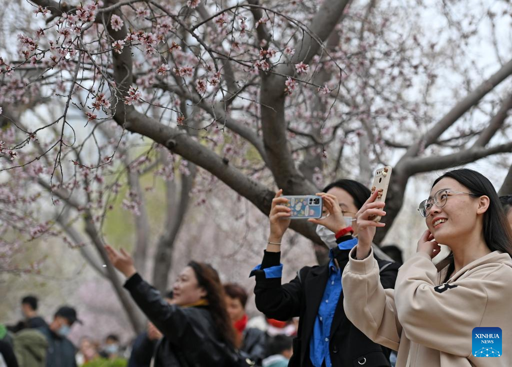 Tourists take photos on the peach blossom embankment along the Grand Canal in Hongqiao district, north China's Tianjin, on March 19, 2023. As the weather gets warmer, the peach blossoms here are in full bloom and have attracted many tourists. (Xinhua/Zhao Zishuo)