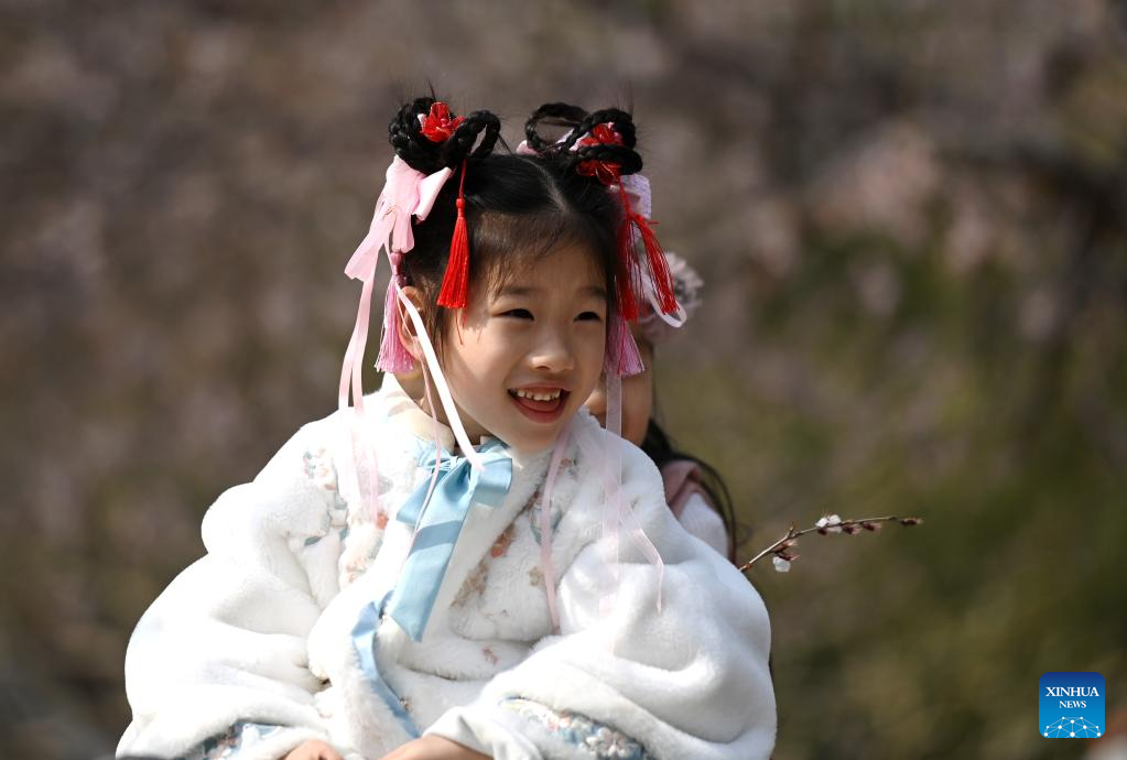 A girl plays at the peach blossom embankment along the Grand Canal in Hongqiao district, north China's Tianjin, on March 19, 2023. As the weather gets warmer, the peach blossoms here are in full bloom and have attracted many tourists. (Xinhua/Zhao Zishuo)
