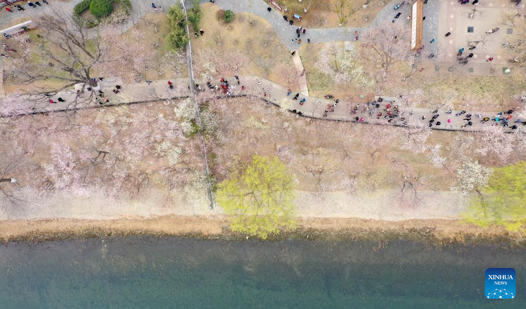 This aerial photo taken on March 19, 2023 shows tourists visiting the peach blossom embankment along the Grand Canal in Hongqiao district, north China's Tianjin. As the weather gets warmer, the peach blossoms here are in full bloom and have attracted many tourists. (Xinhua/Zhao Zishuo)