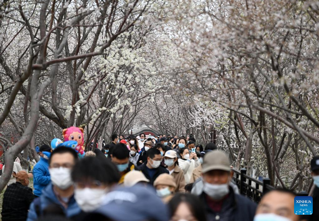 People visit the peach blossom embankment along the Grand Canal in Hongqiao district, north China's Tianjin, on March 19, 2023. As the weather gets warmer, the peach blossoms here are in full bloom and have attracted many tourists. (Xinhua/Zhao Zishuo)