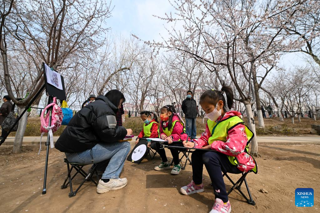 Children learn to draw peach blossoms on the peach blossom embankment along the Grand Canal in Hongqiao district, north China's Tianjin, on March 19, 2023. As the weather gets warmer, the peach blossoms here are in full bloom and have attracted many tourists. (Xinhua/Sun Fanyue)