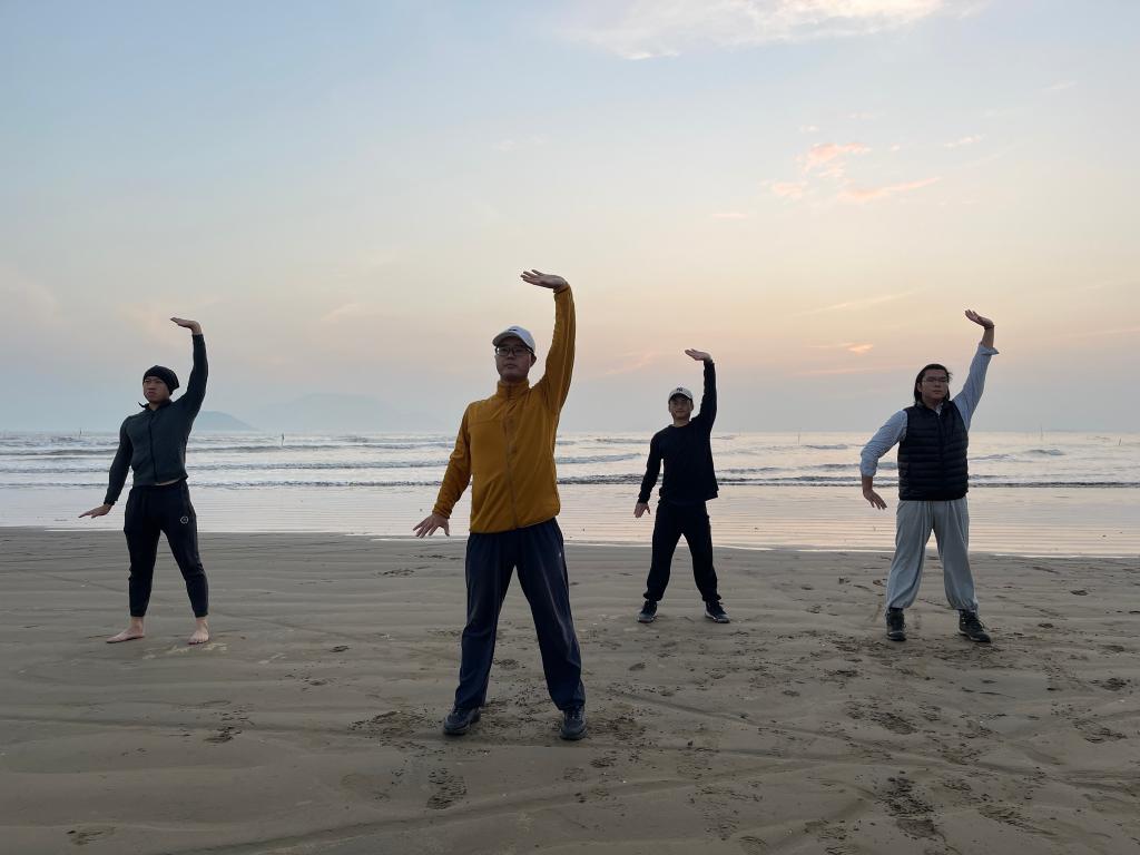 Jiang Nan (second from left) and his friends practice Baduanjin by the sea. (Photo/Xinhua)