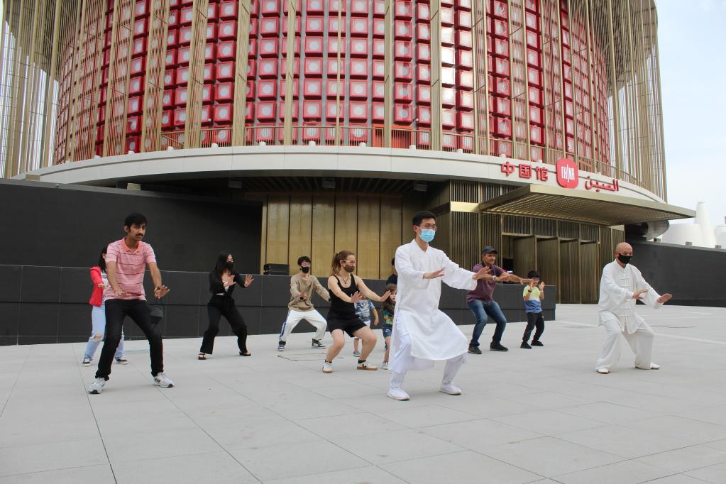 Liu Jianan teaches foreign students Chinese martial arts in front of the China Pavilion in Expo 2020 Dubai. (Photo/Xinhua)