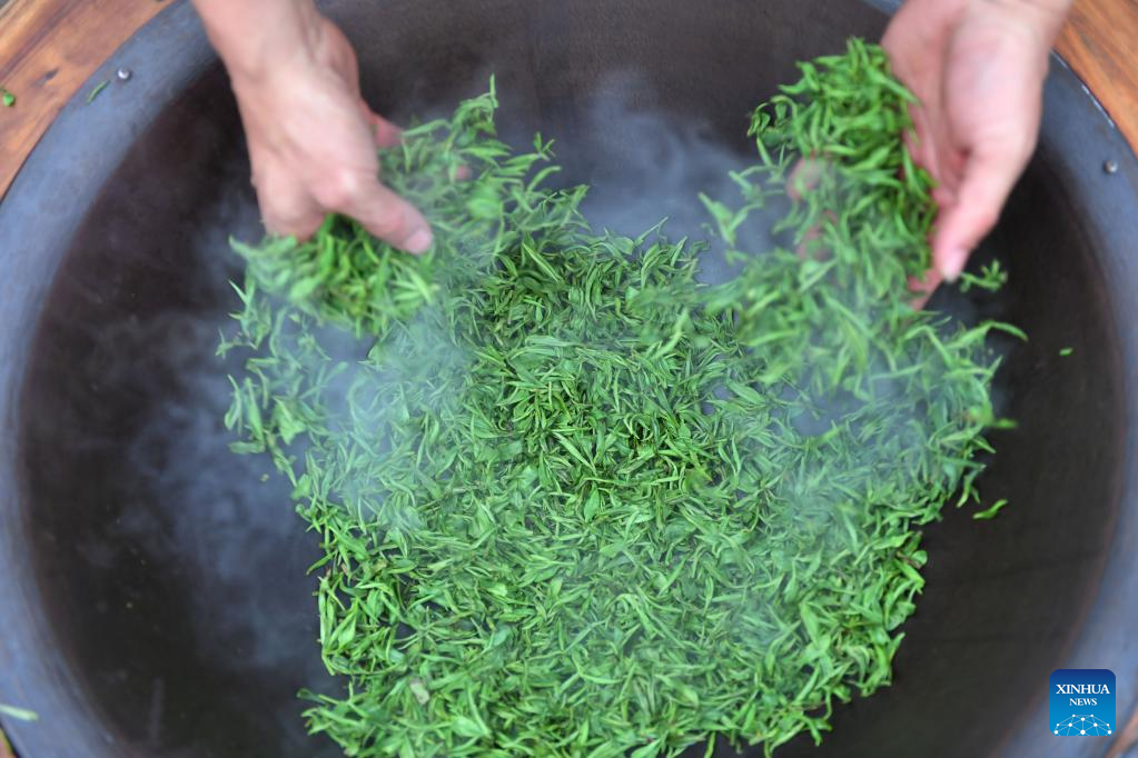 A tea maker stir-fries tea leaves in Tashan Town of Changning, central China's Hunan Province, March 20, 2023. Tea farmers in Tashan are busy picking and processing tea leaves in harvest season. The local economy is boosted as tea planting industry in Tashan is integrated with tourism. (Xinhua/Zhao Zhongzhi)